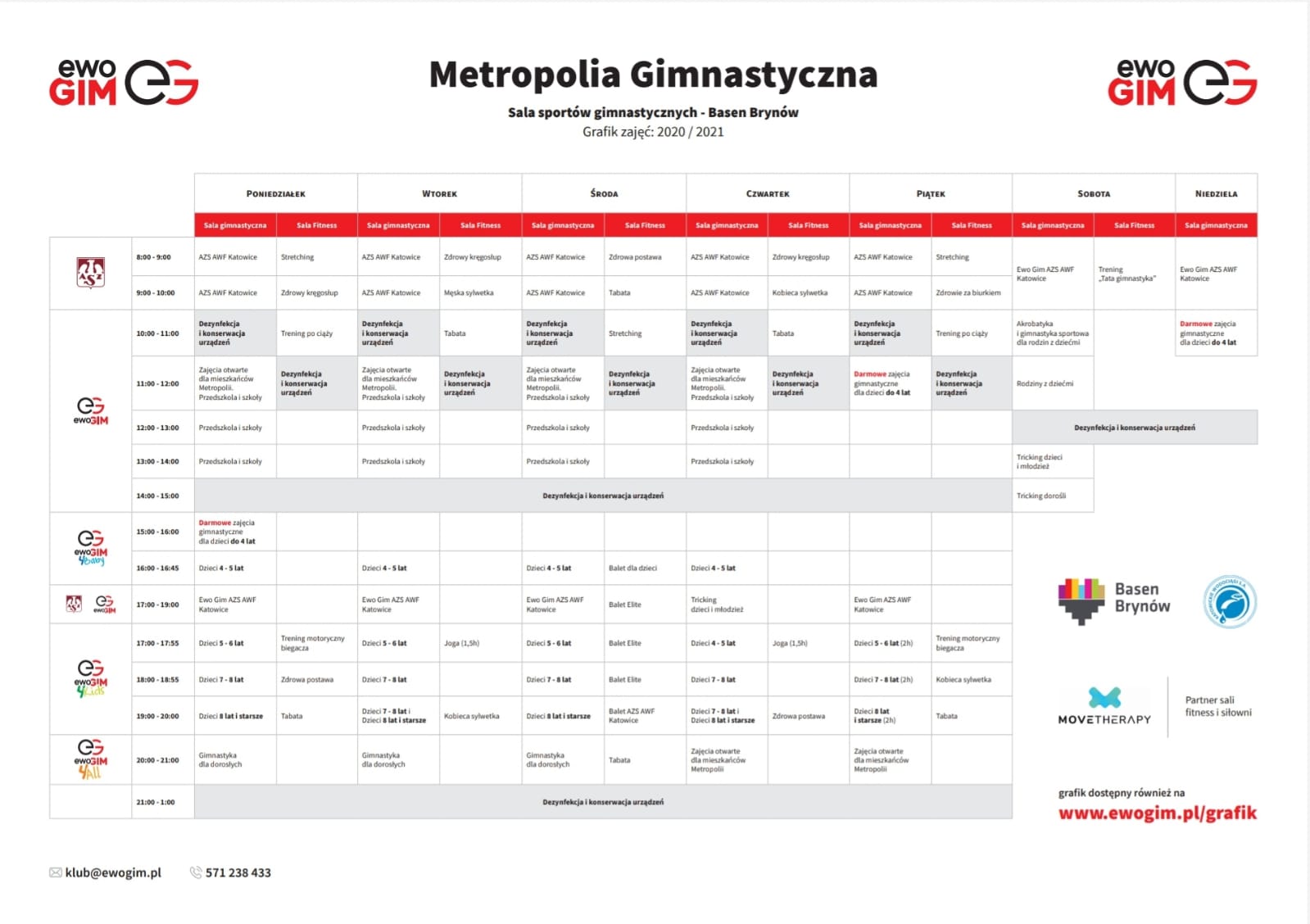 Nowy grafik sali sportów gimnastycznych przy Basenie Brynów. Nie jest to wersja ostateczna, ponieważ w dalszym ciągu ankietujemy naszych klubowiczów i dostosowujemy grafik dokładnie pod Państwa potrzeby. Stąd zajęcia darmowe dla dzieci do 4 roku życia o 15:00, rozszerzyliśmy o 11:00 w piątki i 10:00 w weekendy. Tricking również dla dorosłych i oczywiście nasze flagowe zajęcia z gimnastyki sportowej dla wszystkich grup wiekowych. Sala fitness czeka z zajęciami grupowymi, które odbywają się równolegle z zajęciami dzieci na sali głównej. Zachęcamy do zapisów – spotkajmy się na jednej z sal Metropolii GImnastycznej Ewo Gim